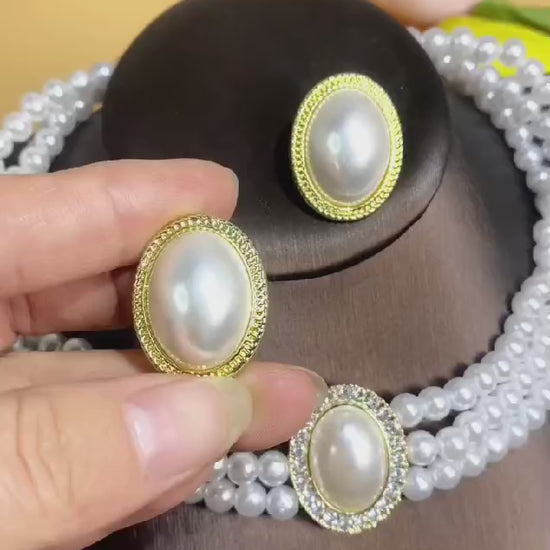 Earrings: Matching stud-style pearl earrings with a similar stone-studded border, perfectly complementing the necklace.